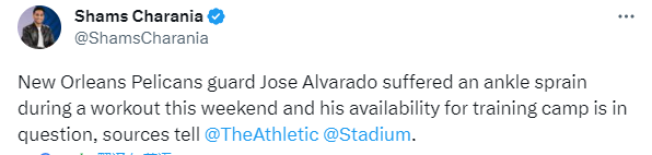 来源:JRS直播网09-18 10:18JRS直播网09月18日,据名记shams报道,鹈鹕后卫阿尔瓦拉多在本周的一次训练中遭遇脚踝扭伤,是否能参加新赛季的训练营存疑;新赛季还没开打,鹈鹕接连遭遇伤病,阿尔瓦拉多扭伤脚踝归期未定,墨菲更是因伤预计伤停10-12周。