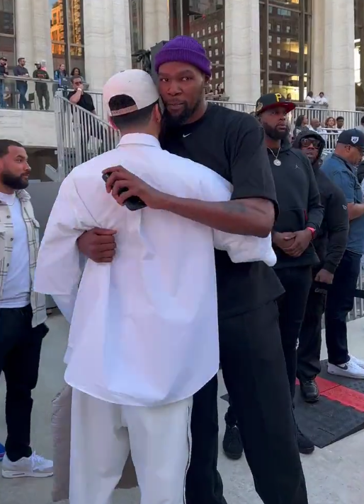 在活动现场,杜兰特与基德畅聊(KD听后直摇头),与卡特寒暄拥抱相互致意,与布克击掌拥抱并热聊,杜兰特的小紫帽真的太抢镜,凸显杜小帅独一无二的气质。