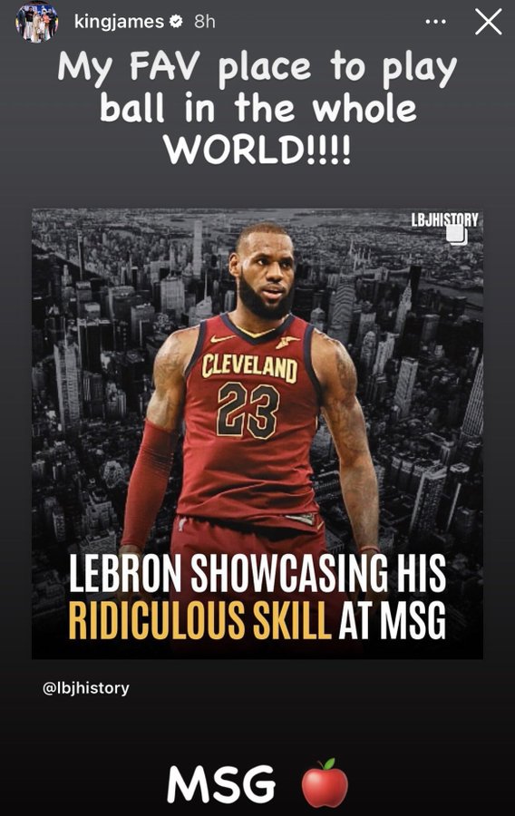 詹姆斯在INS转发了他职业生涯征战麦迪逊广场花园球场的精彩集锦,配文写道:全世界我最喜欢打球的地方!麦迪逊广场花园。