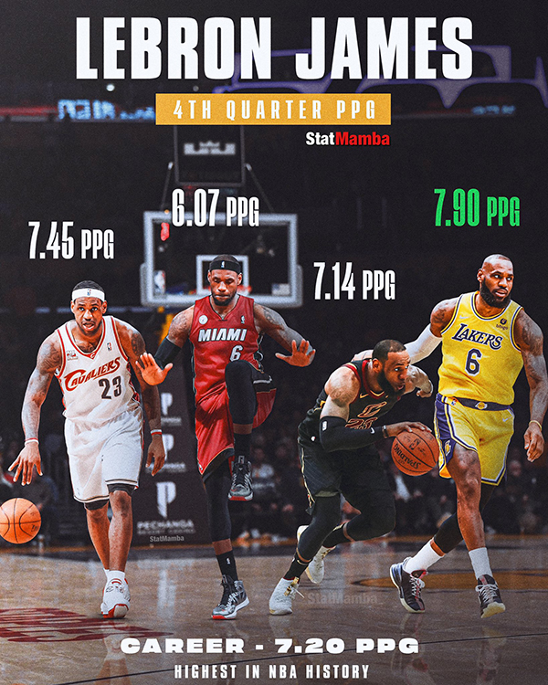 美媒又晒出詹姆斯创造的两大历史第一纪录——生涯末节场均7.2分位居历史第一,湖人时期末节场均7.9分位居生涯各个时期最高。