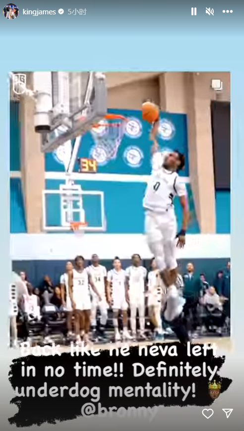 詹姆斯还晒出大儿子布朗尼的大风车暴扣视频,配文写道:很快回来,就像从未离开!带着下狗的心态!