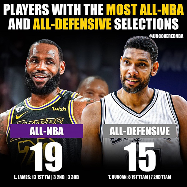 詹姆斯19次入选最佳阵容同样排名历史第一,期间13次入选最佳一阵、3次最佳二阵、3次最佳三阵;邓肯15次入选最佳防守阵容也是历史之最,8次最佳一阵和7次最佳二阵。