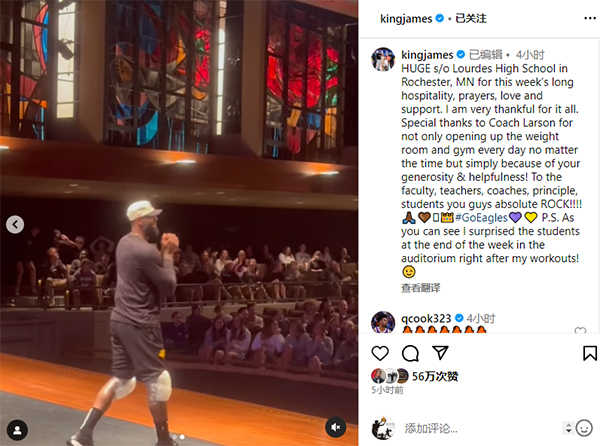 老詹配文写道:感谢明尼苏达州罗切斯特市卢尔德高中本周热情的款待、爱和支持。我非常感谢这一切。在此,我要为拉尔森教练送上特别的感谢,无论什么时候,他都为我开放了健身房和训练场,感谢你的慷慨和帮助!致全体员工、老师、教练、校长、学生们!你们真的棒极了。PS正如各位在视频中所看到的,我在训练结束后在礼堂内给学生们送上了一份惊喜。
