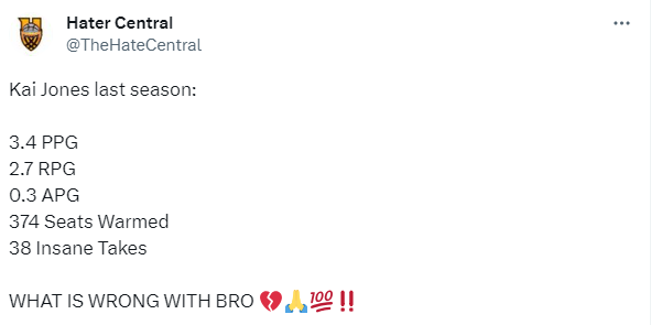 凯-琼斯口出狂言,一系列狂言引热议,有球迷表示我现在越来越不想成为黄蜂球迷了,还有球迷表示需要有人告诉他谦虚一些;美媒晒琼斯上赛季的数据,场均仅3.4分2.7篮板0.3助攻,并且表示:兄弟,你怎么了?