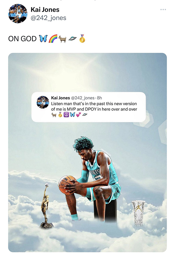 凯-琼斯:那都是过去式了,全新版本的我是MVP+DPOY。(凯-琼斯还特意发推晒出自己将夺得MVP和DPOY两项年度大奖的P照)