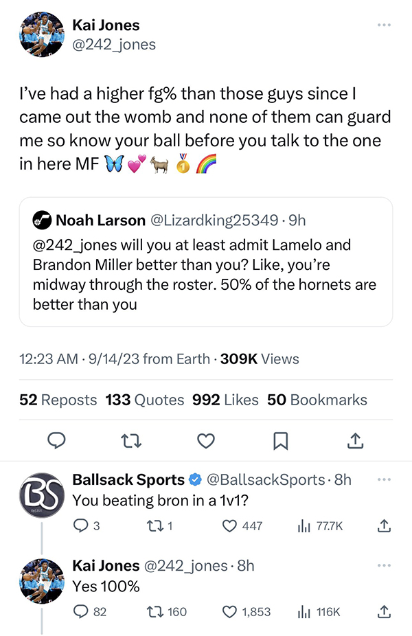 来源:JRS直播网09-15 09:22JRS直播网09月14日近日黄蜂球员凯-琼斯的言论引热议,狂言单挑能够打爆乔丹、詹姆斯和奥尼尔,还直言他自出生就比三球和米勒强;还公开声明全新版本的自己将夺得MVP和DPOY。