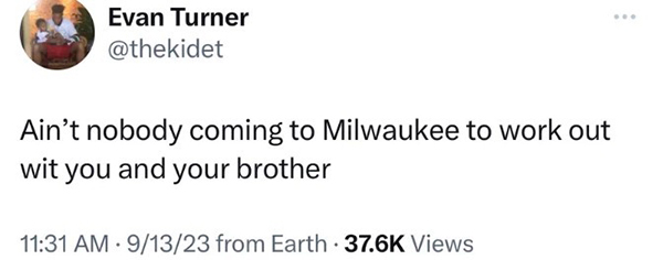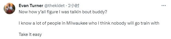 字母哥曾拒绝詹姆斯、杜兰特、哈登等球星的训练邀请,其中一个原因是他不想和对手称兄道弟。对此,前NBA球员特纳更推道:“没有人会来密尔沃基和你们兄弟一起训练。”“伙计,你们现在都知道我在说什么了吗?我在密尔沃基认识很多人,我想没人会和他们(字母哥及其兄弟)一起训练。放松点。”“我像字母哥那样打球。”