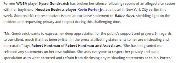今日,小波特家暴事件的受害者凯丝-冈德雷齐克(前WNBA球员)回应此事,冈德雷齐克的代表发表了一份声明,表示:冈德雷齐克女士对公众的支持和祈祷表示深深的感谢,但媒体上写的很多报道都是误导和不准确的,她没有自愿同意或发表任何声明。她要求所有人尊重她的隐私,避免对所发生的事情进行猜测,并避免披露任何关于波特先生的误导性陈述。