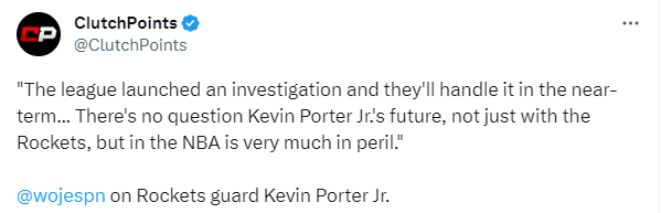 目前NBA和火箭官方都已介入小波特家暴女友事件之中,据名记woj报道,联盟发起了调查,他们将在短期内处理此事,毫无疑问,小凯文-波特的未来,不仅在火箭队,而且在 NBA都处于危险之中。