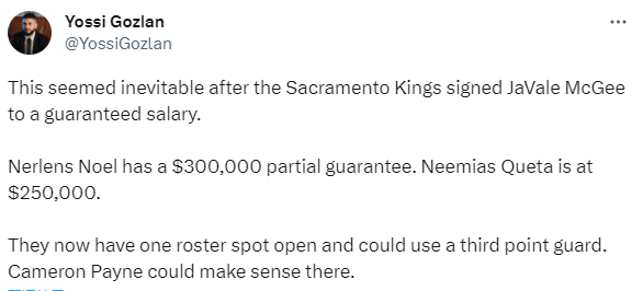 NBA薪资专家Yossi Gozlan表示用保障合同签下麦基后,国王裁掉他们是不可避免的,现在他们有一个空缺的名额,可以签下第三名控球后卫,签下卡梅伦-佩恩对球队是有意义的。