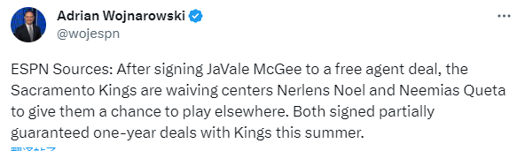 诺埃尔在今年7月23日与国王签下了一份价值320万美元的一年合同,其中有30万美元得到保障;奎塔在八月初也与国王签下了一份一年期的部分保障合同,保障金额仅有25万美元。