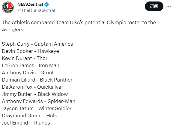 美媒TA撰文排出了巴黎奥运美国男篮的潜在阵容所对应的超级英雄,具体情况如下:
