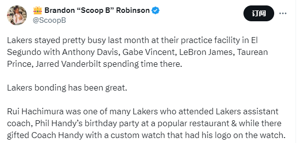 八村垒是众多参加湖人助教菲尔-汉迪生日派对的湖人球员之一,他送给汉迪教练一块定制手表,手表上有八村垒的标志。