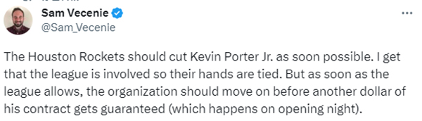 名记woj表示小波特在火箭和NBA的未来都岌岌可危;小波特殴打女友事件引热议,火箭记者Sam Vecenie表示火箭应该在新赛季开始前赶紧裁掉小波特;名记Keith Smith表示他已经有太多“第二次机会”了,太卑鄙了;球迷投票,有86.1%的球迷认为小波特的NBA生涯已经结束了。