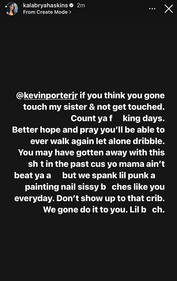 凯斯雷-冈德雷齐克的姐姐发声,在社媒上炮轰以及威胁小波特,她表示数一数你家暴我妹妹的日子,希望并祈祷你无法出狱,更别说打球了,你过去可能逃脱了这种惩罚,因为你的妈妈打不过你,但我们每天都打像你这样的娘娘腔,我们会报复你的。