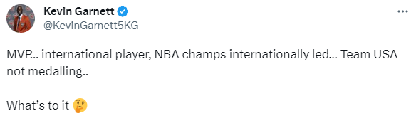NBA名宿凯文-加内特发推质问美国男篮,写道:NBA的MVP是国际球员,NBA总冠军也是由国际球员带领的。美国世界杯没有拿到奖牌,啥情况?