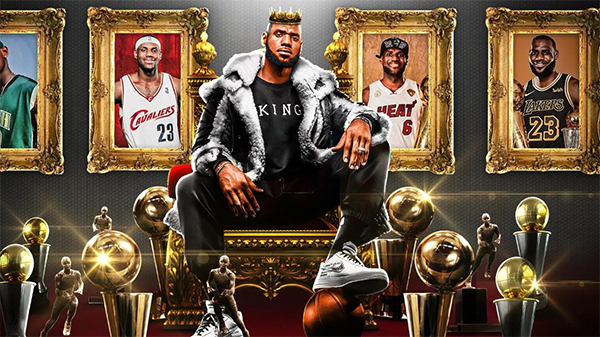 詹姆斯在家中看电视并且晒出四座总冠军奖杯;生涯至今,詹姆斯先后带领迈阿密热火、克利夫兰骑士和洛杉矶湖人三支球队夺得NBA总冠军,并且4次夺得总决赛MVP。