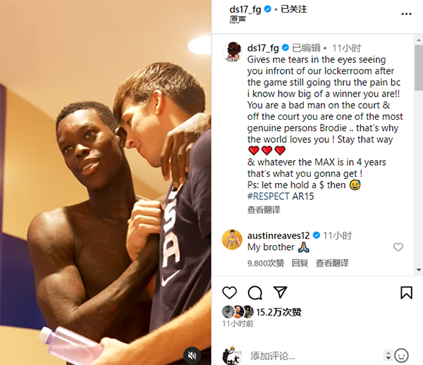 詹姆斯转发里夫斯和施罗德在德国队更衣室外深情拥抱的一幕,配文写道:我的兄弟们,我爱你们这些男孩。