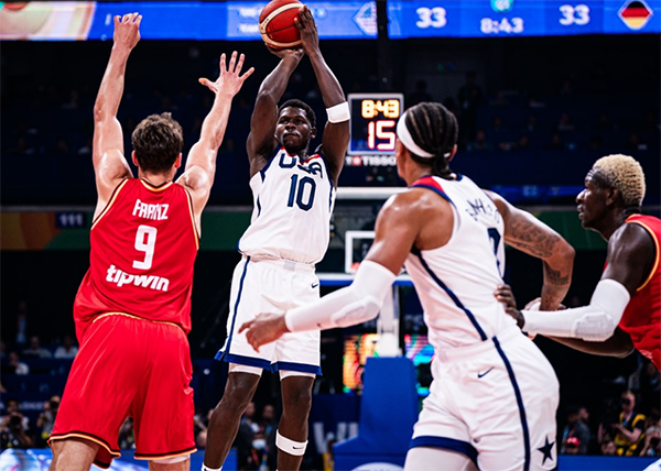 世界杯半决赛精彩一战,美国男篮第在第一节一度落后10分的情况下疯狂反扑,半场打完60-59反超1分;下半场美国队第三节被德国打出17-8攻势,并且三节打完落后10分,末节美国男篮打得十分被动,关键时刻爱德华兹和里夫斯带队看到翻盘的希望,可施罗德一传一攻稳住局面,再加上爱德华兹致命失误,最终美国队2分惜败,无缘本届世界杯决赛,更是无缘冲击队史第6个世界杯冠军。