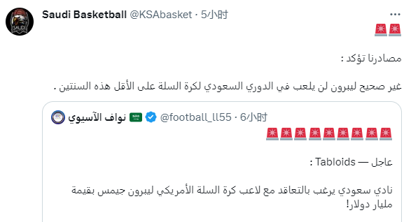 外媒报道沙特俱乐部想用10亿美元的巨额合同签下詹姆斯,不过沙特媒体KSA Basket表示,事实并非如此,勒布朗至少2年内不会参加沙特篮球联赛。