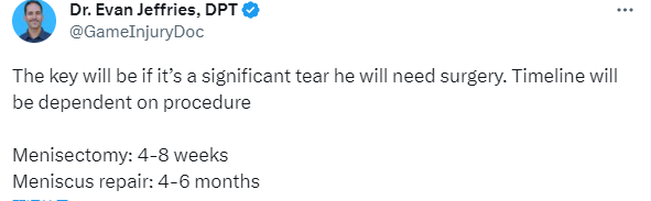 墨菲的伤势如何?左膝半月板受伤,暂不确定是否需要接受手术。医学专家Evan Jeffries表示,关键是如果半月板撕裂严重,墨菲就需要手术,若接受半月板切除手术,预计缺席4-8周;若接受半月板修复手术,预计缺席4-6个月。