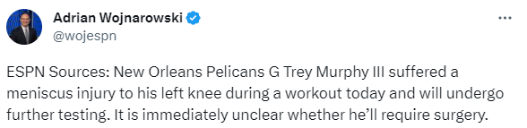 来源:JRS直播网09-06 10:47JRS直播网09月06日,新赛季还没到来,鹈鹕遭遇伤病打击,据名记Woj报道,鹈鹕前锋特雷-墨菲三世在今天的训练中遭遇左膝半月板受伤的伤病,他将接受进一步的检查,目前还不清楚墨菲是否需要手术。