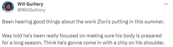 锡安正在积极备战新赛季,此前锡安在宣传自己的第三代签名鞋时,他表示他仍然会震惊世界,他只需要等待时机。