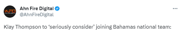 此前巴哈马篮协主席尤金-霍顿曾表示,巴哈马会探索归化汤普森的可能性,克莱必须表达出为巴哈马出战的意愿,另外美国篮协也得同意放人才行。