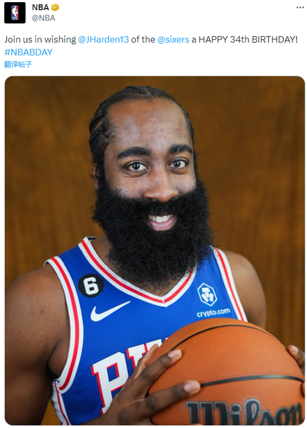 在哈登34岁生日这一天,76人官方晒照送祝福,写道:生日快乐,詹姆斯-哈登;NBA官方也祝贺哈登生日快乐。