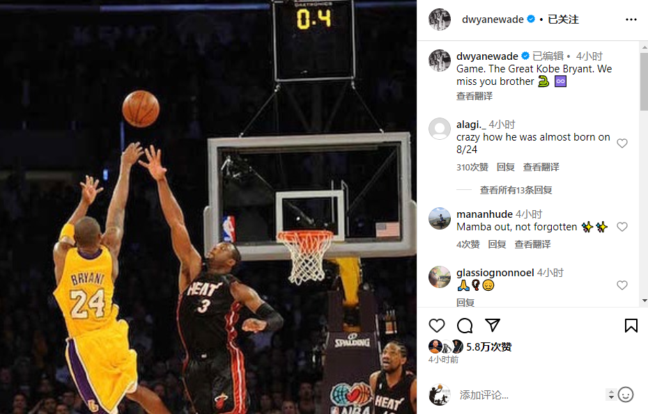 韦德INS晒科比0.4秒绝杀热火的经典一幕,配文写道:最伟大的科比,想你了兄弟,永远黑曼巴。