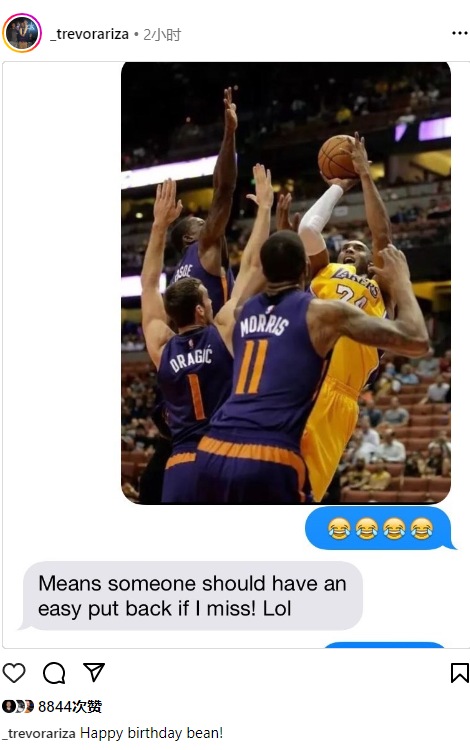 勇士球员保罗晒昔日合影致敬保罗,科比前队友阿里扎发布一张科比在生前与他的聊天记录截图,并祝科比生日快乐。在双方的聊天记录中,阿里扎发给科比他顶着三个防守人出手的照片,科比回复道:这意味着如果我投丢了,有个人会得到轻松补篮的机会!哈哈。