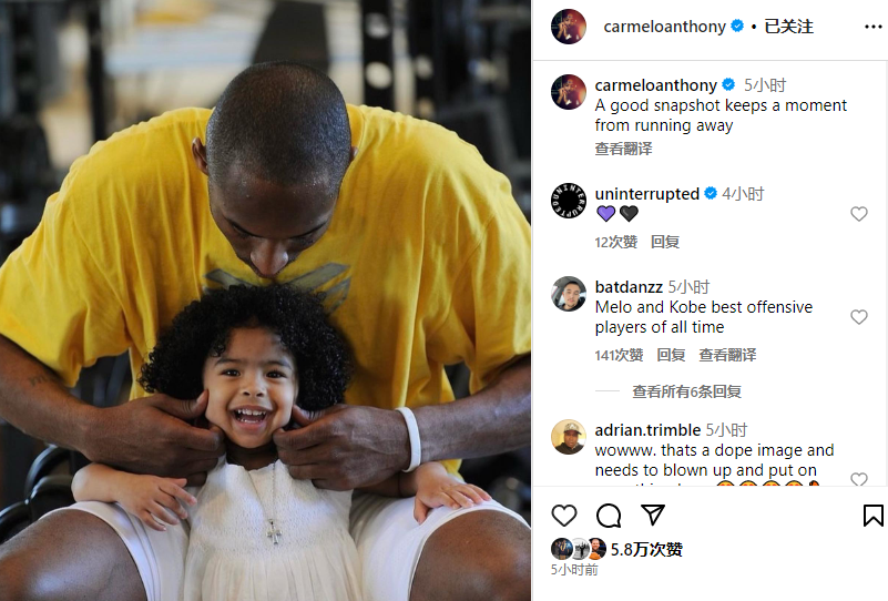 卡梅罗-安东尼INS晒科比和GIGI旧照祝科比生日快乐:一张好的抓拍可以让时间永存。