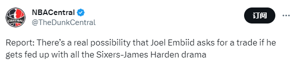 知情人士透露恩比德真的可能对哈登与76人之间的闹剧感到沮丧,可能因厌倦这样的事而提出离队请求。