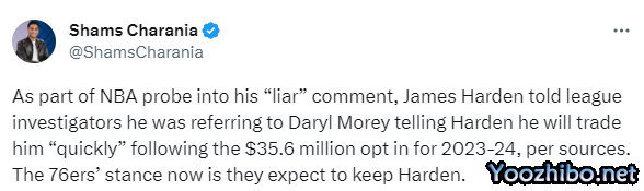 “作为NBA对他针对总经理莫雷“撒谎”言论调查的一部分,詹姆斯-哈登告诉联盟调查员,他是在指责莫雷,因为莫雷告诉哈登,在其选择执行3560万美元的球员选项后,会“迅速”将他交易出去。而76人现在的立场是,他们希望留下哈登。”