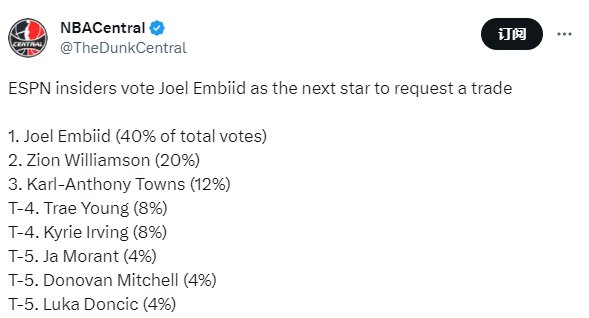 美媒ESPN的专家团针对新赛季的多个话题进行了票选,其中,关于“谁会是下一位申请交易的球星”的票选结果出炉,恩比德高居第一,锡安、欧文和东契奇上榜。