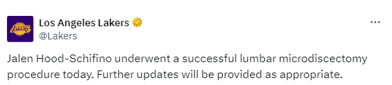 来源:JRS直播网03-22 14:08JRS直播网讯 北京时间3月22日,湖人队又遭伤病打击,湖人官方宣布,球队的17号秀杰伦-胡德-席菲诺于今天成功接受了腰椎微创椎间盘切除手术,没有提供复出时间表。微创椎间盘切除手术:一种外科手术,通过微小的切口使用显微镜或者放大镜来切除椎间盘突出部分,以减轻对神经根或脊髓的压迫。