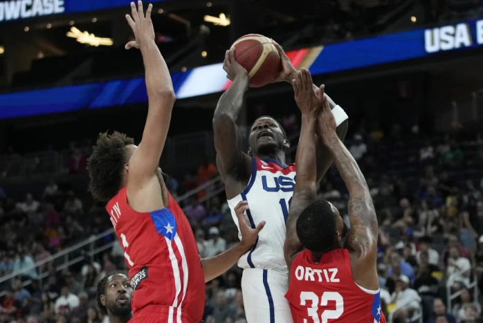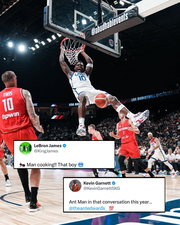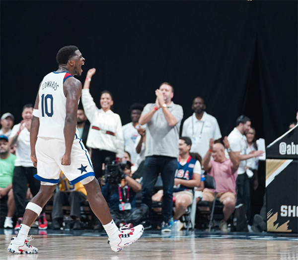与德国队一战,爱德华兹第一节早早命中三分、持球杀到禁区上篮,更疯狂的是爱德华兹接球后直接凶狠隔扣泰斯,如此一球点燃现场,首节独砍11分;不过美国队第二节一度落后到两位数,第三节最多更是落后到16分,即使爱德华兹三节拿到22分,美国队仍旧落后4分。