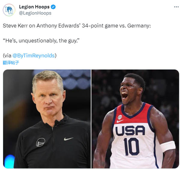 赛后美国队主帅科尔夸赞爱德华兹:毫无疑问,他就是那个男人。