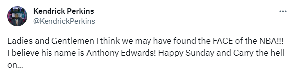 伊戈达拉发推高呼爱德华兹的名字;名嘴帕金斯直言:女士们先生们,我们想我们可能找到了NBA的门面。我相信他的名字叫做安东尼-爱德华兹!
