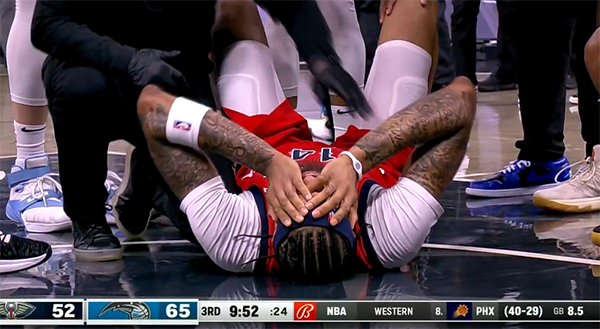 第三节9分52秒,英格拉姆在防守萨格斯时遭遇受伤,左膝出现反关节扭伤的情况,捂着膝盖痛苦倒地,怒砸地板、双手捂脸十分懊恼,之后英格拉姆被两人搀扶离场,返回更衣室接受检查。