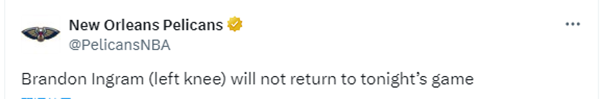 受伤前,英格拉姆首发上场21分钟,12投7中拿到14分4篮板3助攻1抢断,面对东部的魔术,莺歌的进攻手感很不错,却在第三节受伤离场,希望他的伤势别太严重。