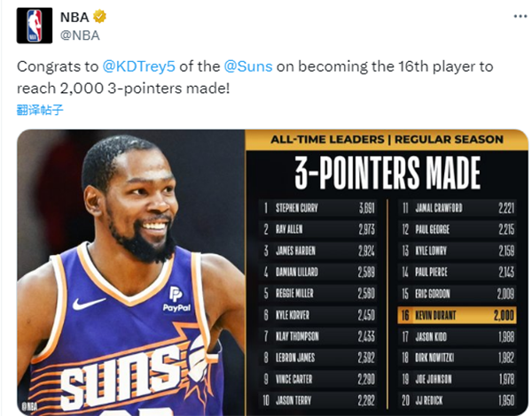 1、杜兰特生涯三分命中数突破2000记大关,现役第9人以及历史第16人