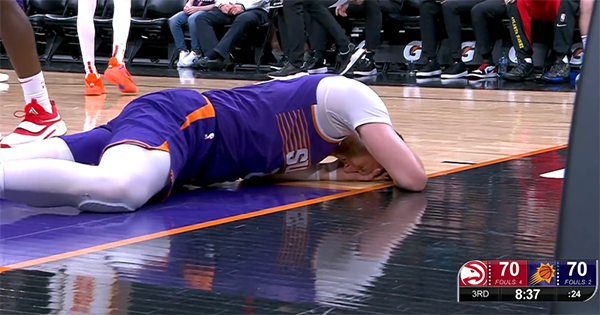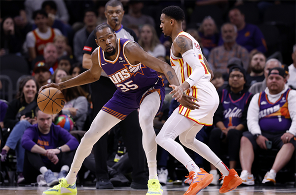 下半场,太阳被老鹰12-5反超比分,期间杜兰特的三分球因踩线被延迟改判进球无效;随后两队僵持僵持不下,5分36秒布克吃到第5次犯规,只能被迫坐回替补席;杜兰特继续带队,戈登和阿伦接连命中4记三分,太阳领先9分后再次哑火以及失误,老鹰8-0追到1分,阿伦2分止血,三节战罢太阳暂时领先3分,这一节杜兰特4中1贡献4分,传球失误后气得挥拳赶紧回防。