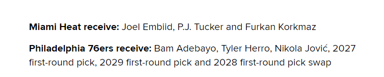 具体的交易方案是热火把阿德巴约、希罗、约维奇、2027年首轮选秀权、2029年首轮选秀和2028年首轮选秀互换权送到76人,得到恩比德、PJ-塔克和科尔克马兹。