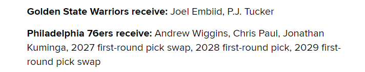 具体的交易方案是勇士队把维金斯、保罗、库明加、2027年首轮选秀权交换,2028年首轮选秀,2029年首轮选秀互换权送到76人,得到恩比德和PJ-塔克。