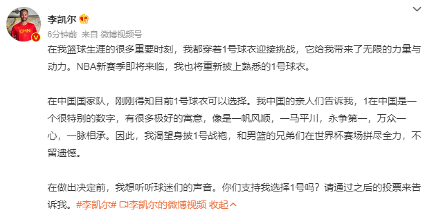 目前李凯尔想要改穿1号,希望和男篮兄弟们在世界杯上拼尽全力,不留遗憾。
