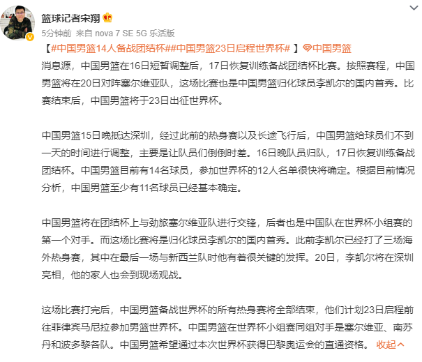 据篮球记者宋翔报道,中国男篮在16日短暂调整后,17日恢复训练备战团结杯比赛。按照赛程,中国男篮将在20日对阵塞尔维亚队,这场比赛也是中国男篮归化球员李凯尔的国内首秀。比赛结束后,中国男篮将于23日启程前往菲律宾马尼拉参加男篮世界杯。