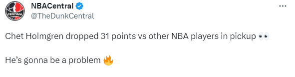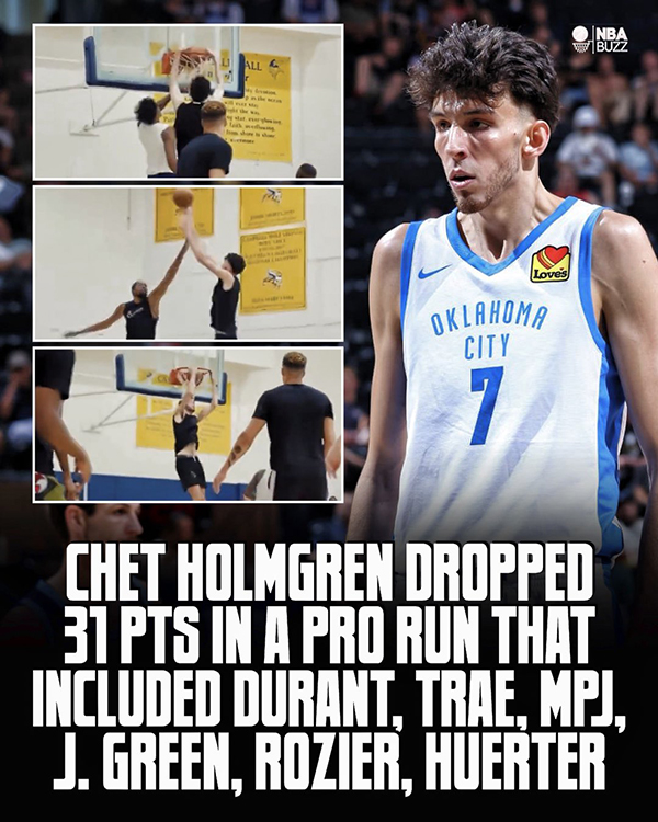 在这一场高端野球局对决中,霍姆格伦与特雷-杨、赫尔特、小里弗斯等人一队,杜兰特、杰伦-格林、罗齐尔和小波特等人一队,雷霆榜眼霍姆格伦的表现很出色。