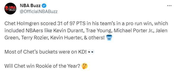 美媒NBA BUZZ表示霍姆格伦在这一场NBA球员组成的比赛中狂砍全队97分中的31分,大多数得分都是在杜兰特头上拿到的,切特会赢得年度最佳新秀吗?