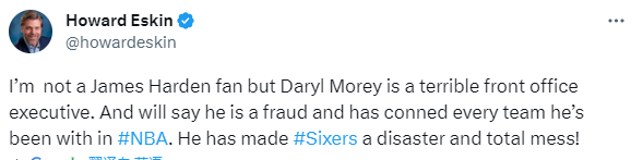 费城当地记者Howard Eskin转发了哈登炮轰莫雷的视频,并写道:我不是哈登的粉丝,但莫雷是个糟糕的高管。我会说他是个骗子,他欺骗了NBA的每个球队,他造成了76人现在的灾难,搞得一团糟。